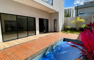 Piscina aquecida com hidromassagem e deck de madeira.